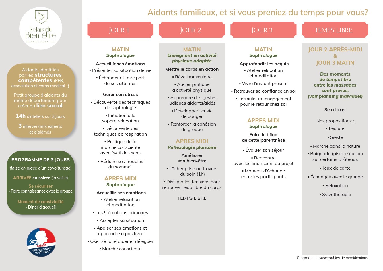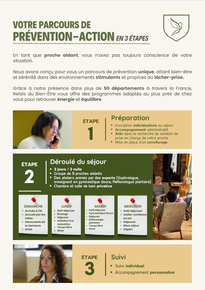 Ces séjours s’adressent aux aidants familiaux. Il leur offre un temps de répit encadré, propice au ressourcement, à la détente et au soutien émotionnel.