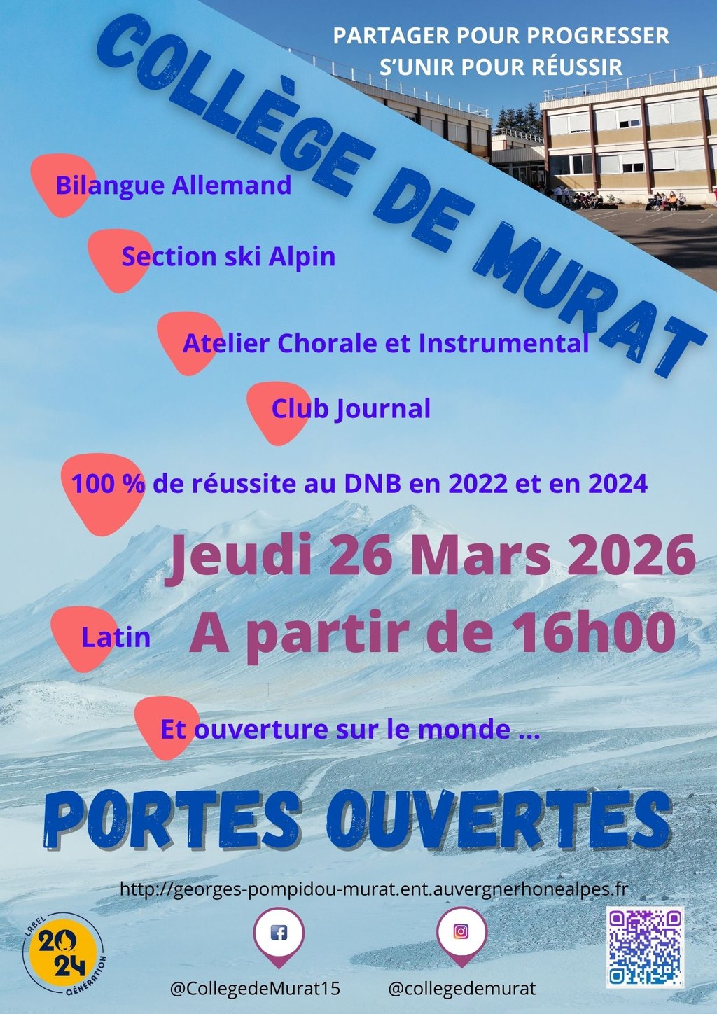 Les portes ouvertes du Collège de Murat auront lieu le jeudi 26 Mars à partir de 16h00.