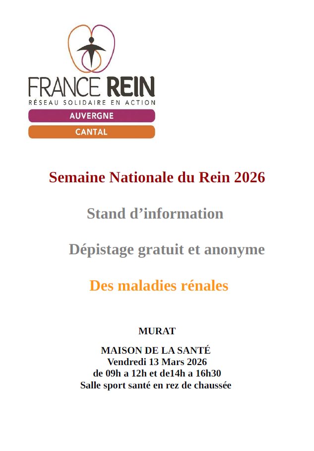👉 A l'occasion de la semaine nationale du Rein, France Rein sera à Murat le vendredi 13 mars prochain pour une journée de prévention auprès des Muratais.