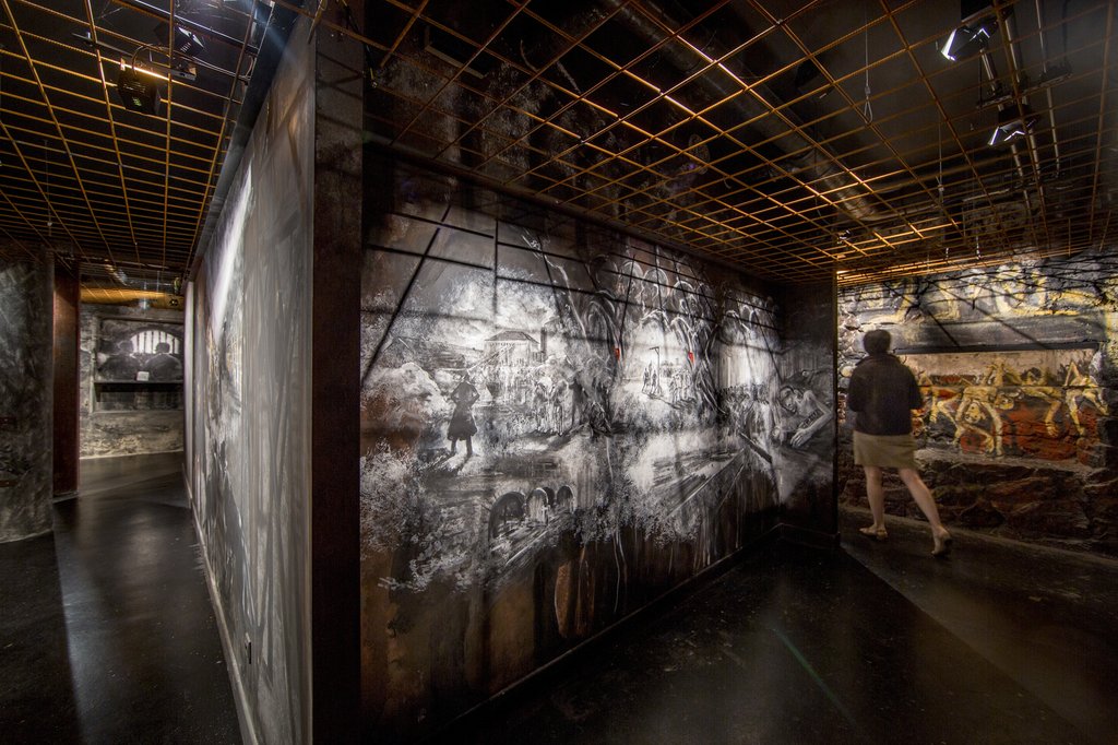 Plongés dans l’obscurité, dès l'arrivée en prise directe avec les lieux, autour de fresques peintes directement sur les murs du sous-sol et guidés par un son et lumières, les visiteurs sont invités à revivre en images la Résistance, la Déportation, la survie dans les camps.