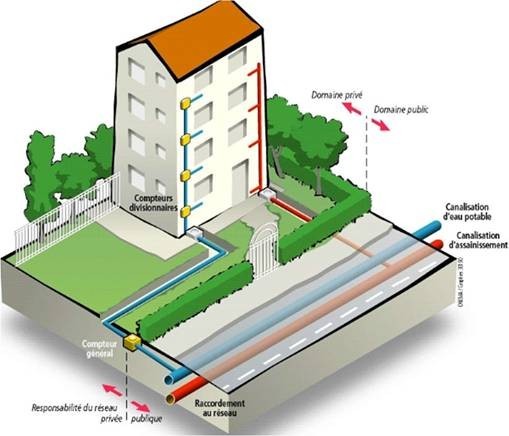 La distinction entre le domaine public et le domaine privé détermine la responsabilité de chacun entre l’abonné et la commune. La distinction se fait au niveau du compteur (propriété communale) qu’il soit à la limite de la propriété privée ou dans la maison.